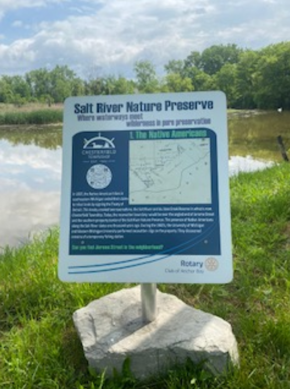 At the end of Hooker Rd, off Jefferson Ave is a small slice of Heaven. This is the Salt River Nature Preserve which has great history in the beginning origins of Chesterfield and New Baltimore. Anchor Bay Rotary has built a pollination garden complete with a sitting bench where you can sit and take in the sights of the Salt River. You also will find within the park 8 signs, pictured above that will educate you on several interesting and sometimes unknown facts about the area and its early settlers. We continue each year to build the garden and park area which also now includes a canoe/kayak launch. Each year we hold a clean up of the park in conjunction with Chesterfield’s clean up day. Come out and join us.